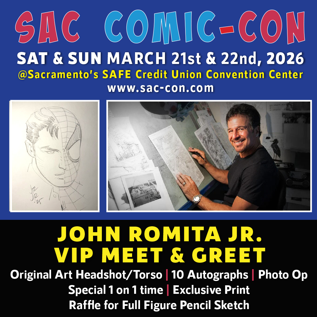 John Romita Jr. is hosting an exclusive VIP Meet and Greet on Saturday March 21st from 4:30pm – 6pm and Sunday March 22nd from 3:30pm – 5pm. There are only 40 opportunities available per day and once they’re gone… THEY’RE GONE! As part of this Sac Comic-Con 2026 event, buyers will get one drawing by John, receive a signed exclusive 11×17″ print, be entered into a drawing for a full figure Spidey pencil artwork, and more!